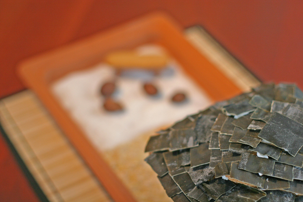Stopping by the Asian food market, H picked up some Dashi Kombu for use as shingles, rice cracker mix for decorative features and walk stones, 5-grain cereal for the turf, table sugar for the sand in the rock garden, whole dried nutmeg seed pods for the rocks in the rock garden and rice spring roll skin for the windows and door.