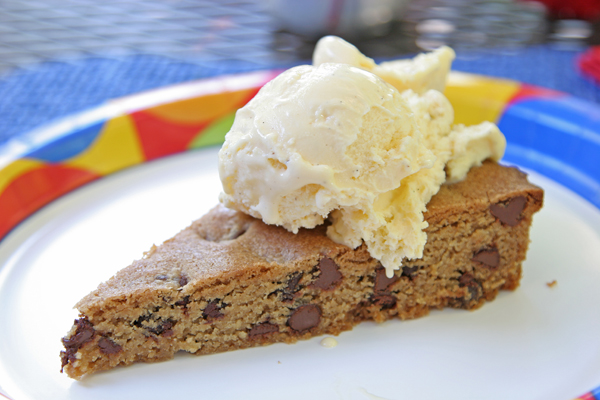 This particular holiday arriving in the middle of the week meant that we did not have much time to prepare a dessert, but you can make the common a bit more elegant simply through presentation. H mixed up a standard batch of her chocolate chip cookie mix and pressed it into a torte pan. When done, the “cookies” were sliced up and served with some vanilla bean ice cream to help deal with the triple digit heat that has assaulted the West for the past while.