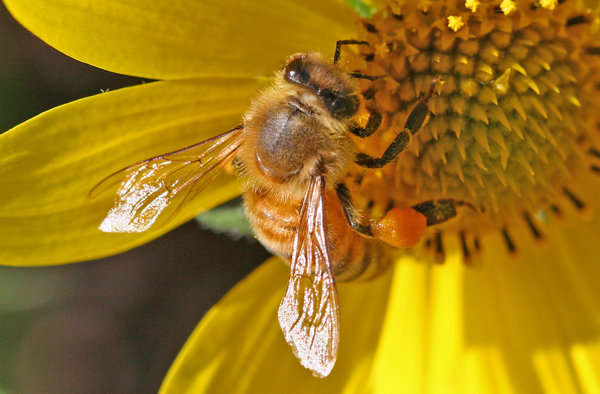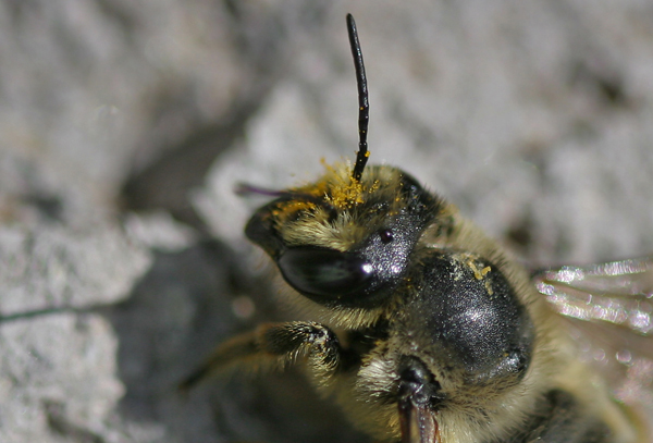 A leafcutter bee (Megachile sp.) dusted with pollen and found in Teton Valley, Idaho. In addition to the large compound eyes, note in the image below, the smaller eyes on top of the head called ocelli. These eyes contain photoreceptor rods and process information related to the wavelength of light, the intensity and likely integral of light, helping the bees to determine dusk which signals them to return to the hive.