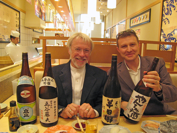 At any rate, because we got our work done early it opened up tomorrow for work in the hotel room and a little excursion out onto the town. But first, after work, we did the Japanese thing and went for a sushi dinner to solidify our future collaboration and celebrate with bieru and four kinds of sake after exchanging gifts. A good time was had by all and I saw something very cool when we were paying to leave. All the sushi items came on plates of various colors that indicate the value of the item you ordered. When it comes time to pay, they wave a wand over your table that automagically tabulates all of the prices through embedded RFID and gives you a total. Very cool.