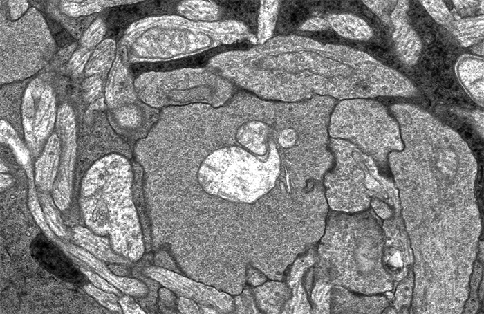 This image sequence shows a communication point between a number of cell types in your retina visualized with electron microscopy. To give you an idea of the scale of what you are looking at, the smallest diameter processes in this image are smaller than the wavelength of light and the very dark lines that appear and disappear in the image sequence are about 300 nanometers long, just greater than the wavelength of white light.